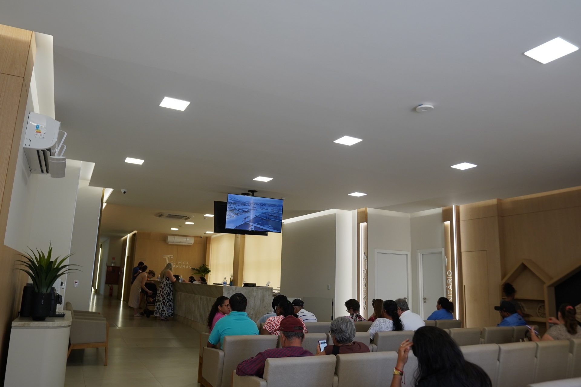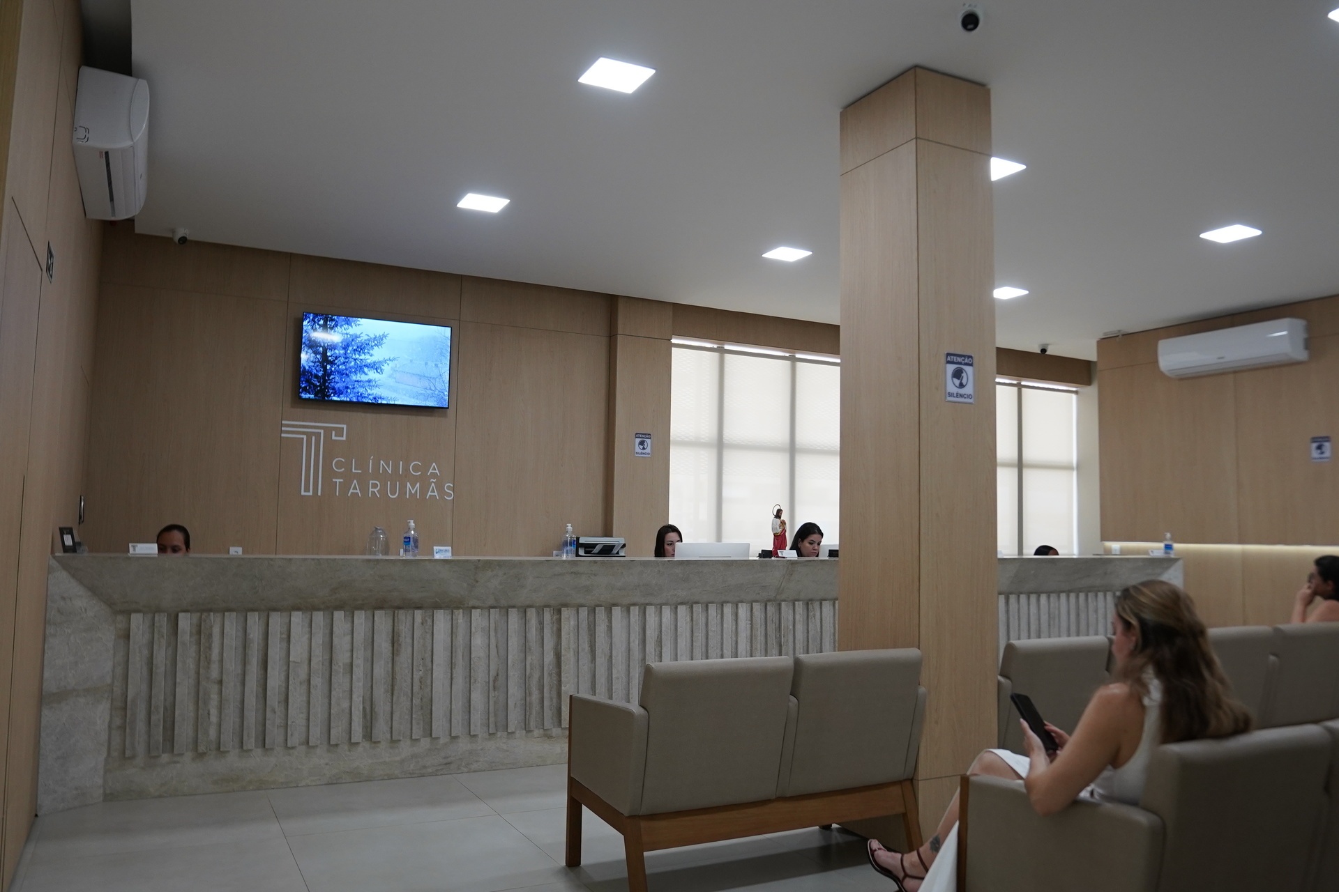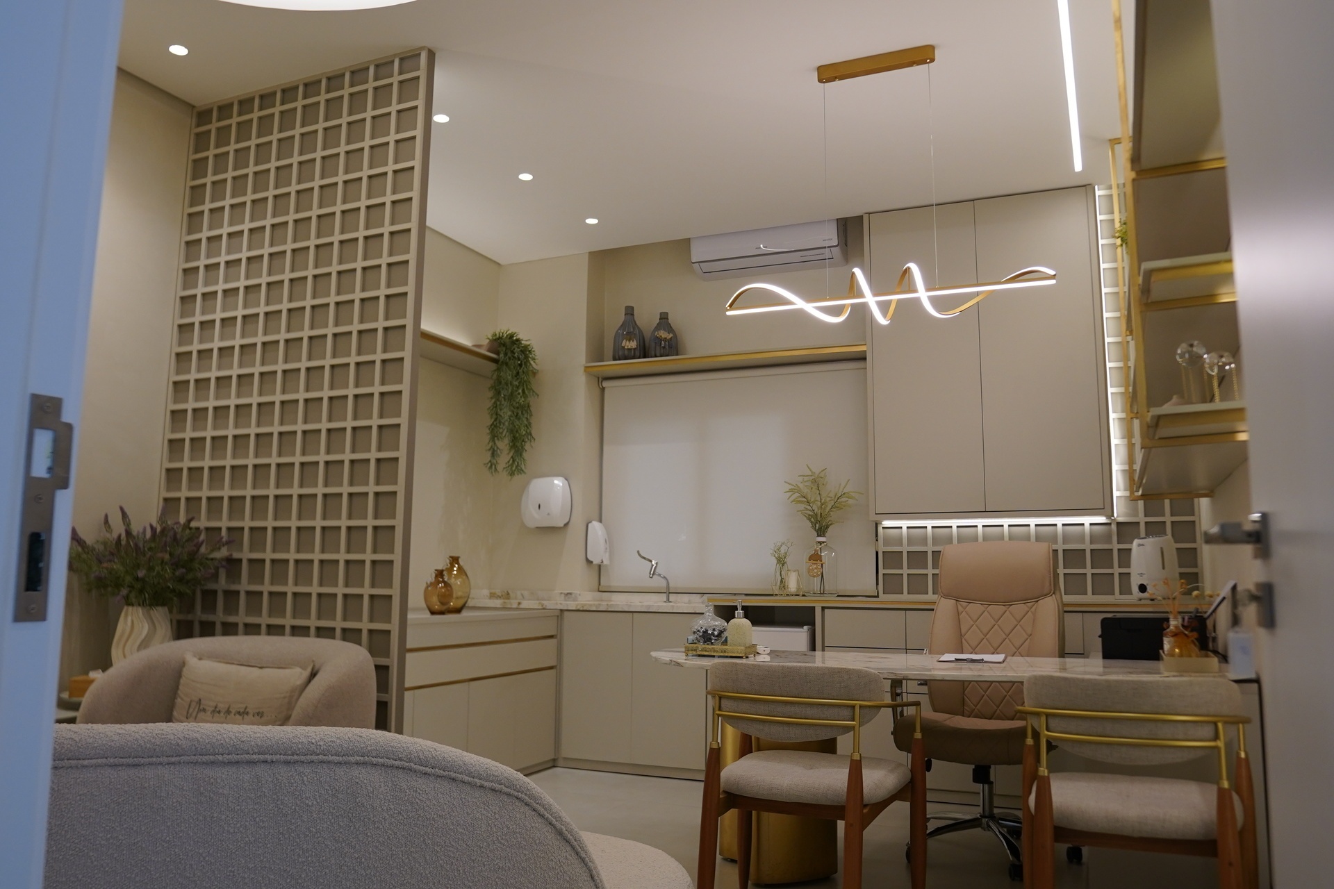 A preocupação com bem-estar e funcionalidade norteou cada detalhe do projeto. Logo na recepção, o visitante encontra um espaço amplo, iluminado e elegante, com cadeiras estofadas de alta qualidade e balcão de mármore para acomodar a equipe de recepção. Um investimento robusto em climatização garante conforto térmico, enquanto o isolamento acústico preserva a privacidade dos atendimentos, mesmo em horários de maior movimento.