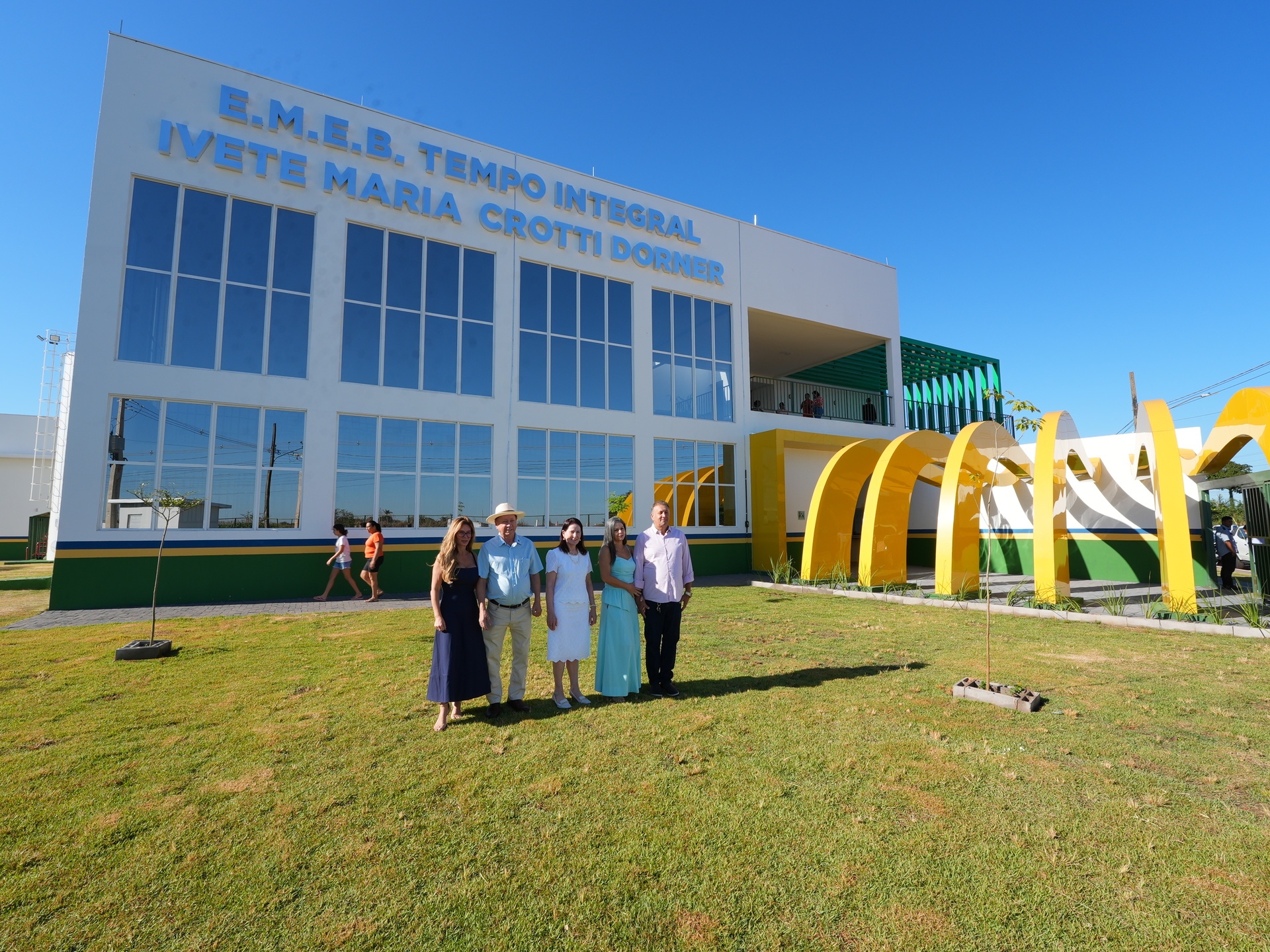 Somente em novas unidades escolares, o município entregou importantes obras que mudaram a realidade de centenas de famílias. Um dos marcos foi a construção da primeira escola de tempo integral da cidade — a EMEB Ivete Maria Crotti Dorner, no Residencial Sabrina, inaugurada em maio de 2025. O investimento ultrapassou R$ 25 milhões, contemplando 5.965 m² de área construída, 16 salas, auditório para até 208 pessoas, biblioteca, laboratórios e refeitório moderno.