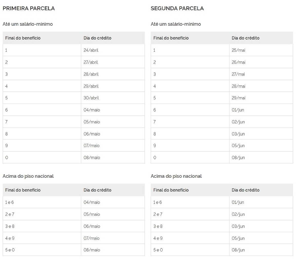 Calendário de pagamento da primeira parcela inicia em 24 de abril e segue até 8 de maio. A segunda metade será paga de 25 de maio a 8 de junho.