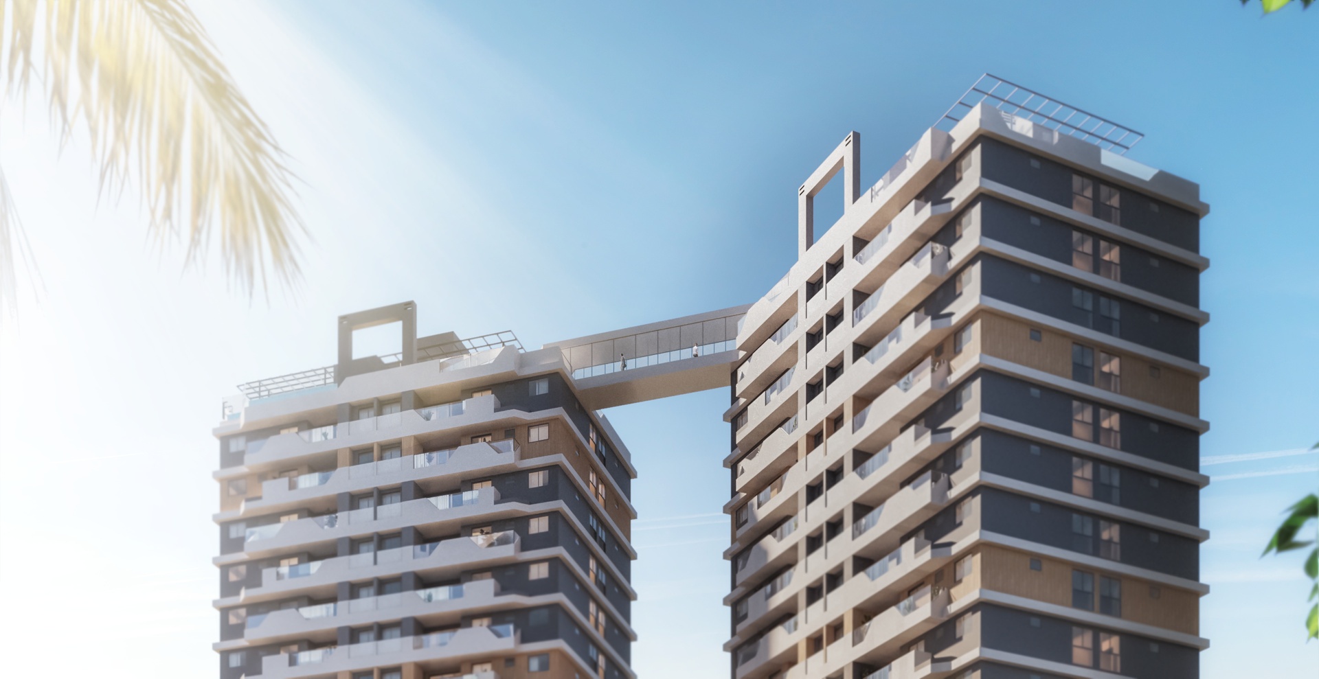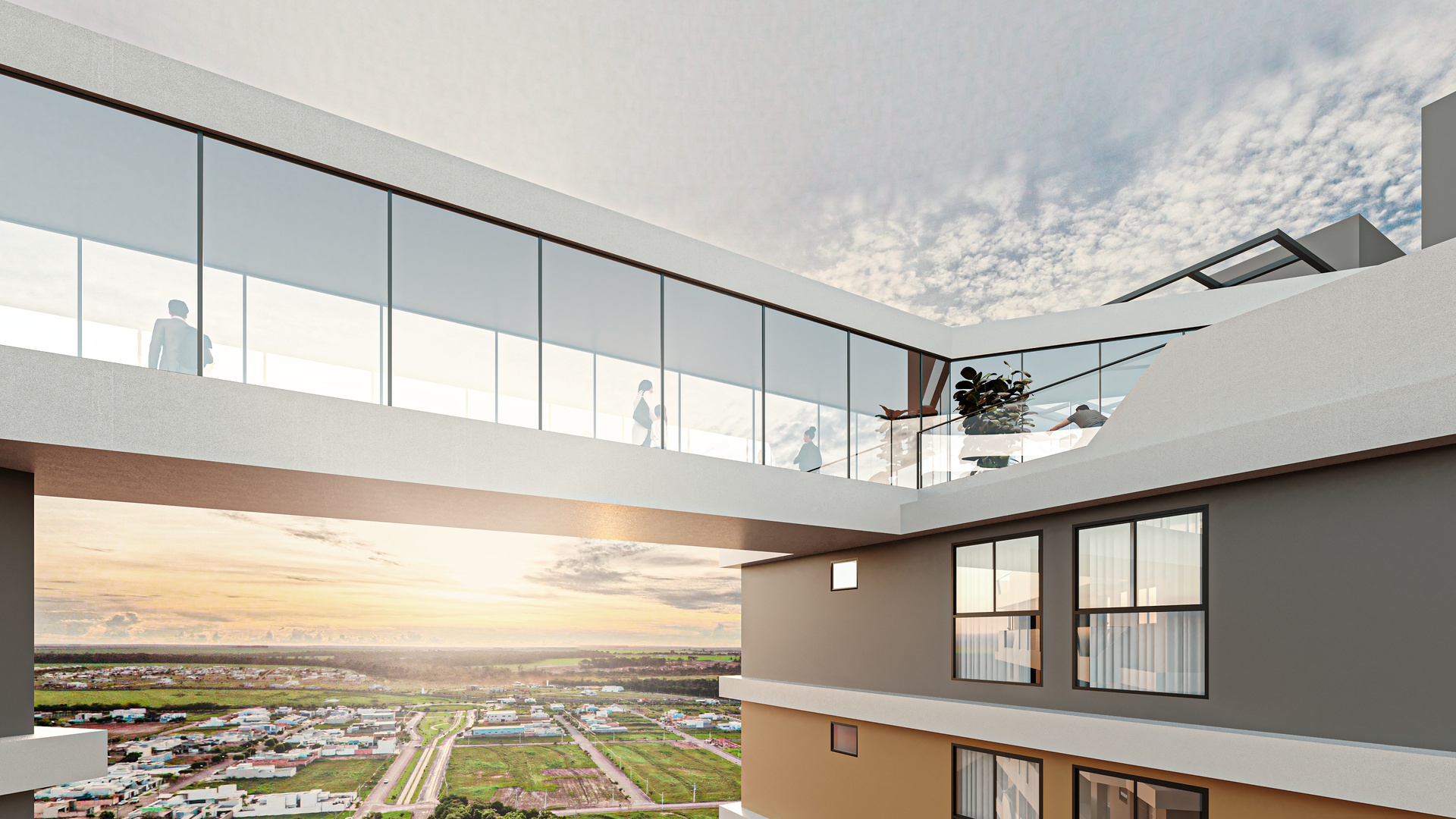 Entre os elementos arquitetônicos de destaque, está a passarela de contemplação a 64 metros de altura, que conecta as torres e oferece vista privilegiada da cidade — um dos pontos que reforçam o caráter icônico do empreendimento.